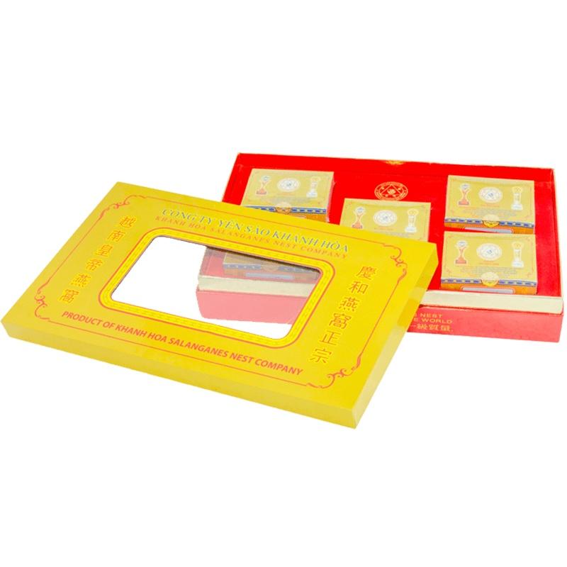 Hộp giấy chữ nhật kích thước 23x28x6 (cm) Gồm 2 hộp, mỗi hộp gồm 60 phần yến, mỗi phần 1,5 g + 60 gói đường phèn, mỗi gói 7 g 100% yến nguyên chất, KHÔNG