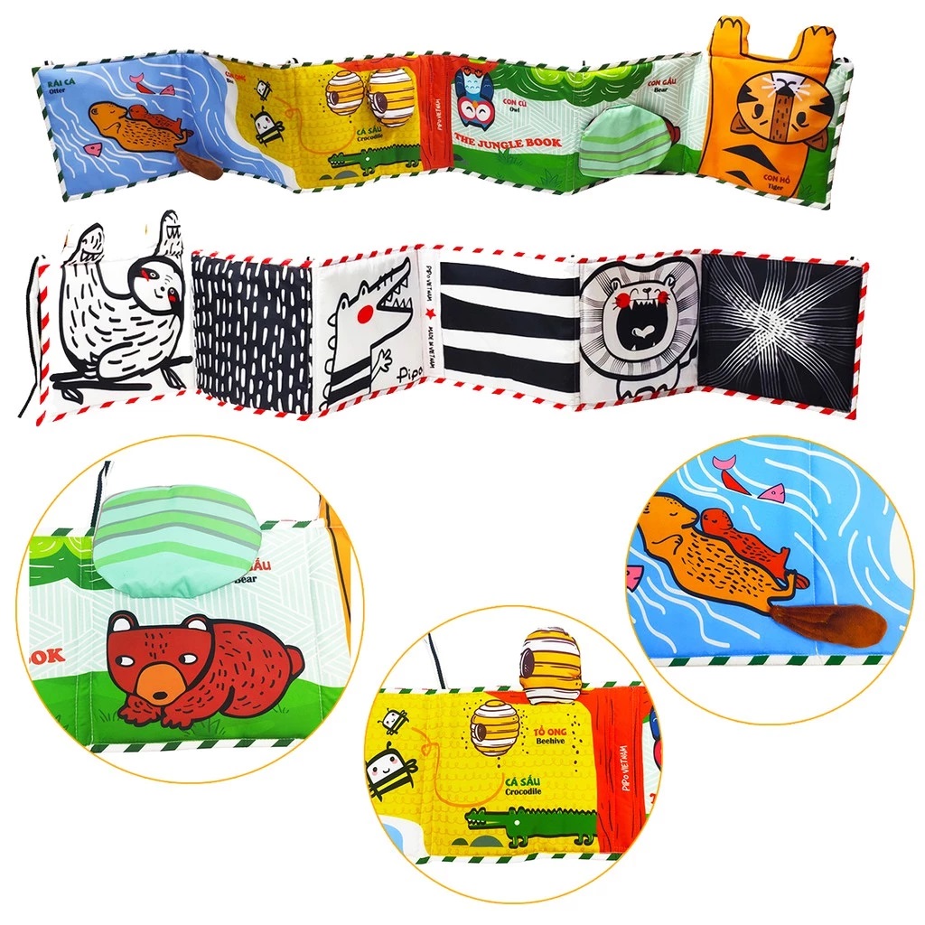 Ziczac Vải Đa Tương Tác Kiêm Đồ Chơi Quây Nôi Cũi Kích Thích Thị Giác Cho Trẻ Sơ Sinh - PiPo Vietnam Đồ chơi vải kiêm quây nôi PiPoVietnam có 2 mặt đen trắng và màu sắc phát triển thị giác trình bày song ngữ Anh - Việt THÔNG SỐ KỸ THUẬT Phù hợp cho thời gian trẻ chưa nhìn được nhiều màu sắc ngoài hai màu đen trắng. Đồ chơi vải PiPoVietnam kiêm quây nôi cũi là một sản phẩm 3 trong 1: